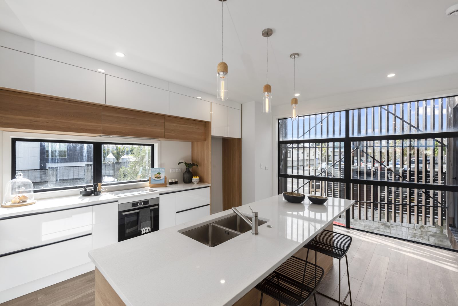 The upper level showcases the stunning design of the home, with the kitchen offering plenty of bench space, storage and timber features, making it the heart of the home. The open plan concept is complimented with natural light pouring through contemporary design through to the study. The perfectly positioned deck faces Hamilton Lake with picture-perfect views. The large master bedroom offers a fully tiled ensuite with his and hers vanity.